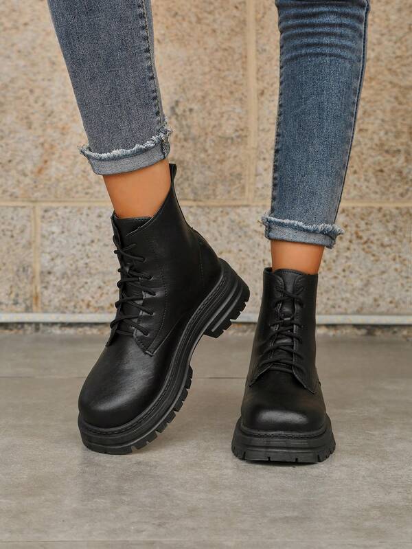 Women's Fashionable British-style Boots With Anti-slip Rubber Soft Sole, Lace-up Motorcycle Boots