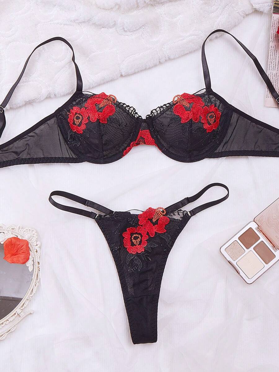 Women's Floral Embroidery Mesh Sexy Lingerie Set