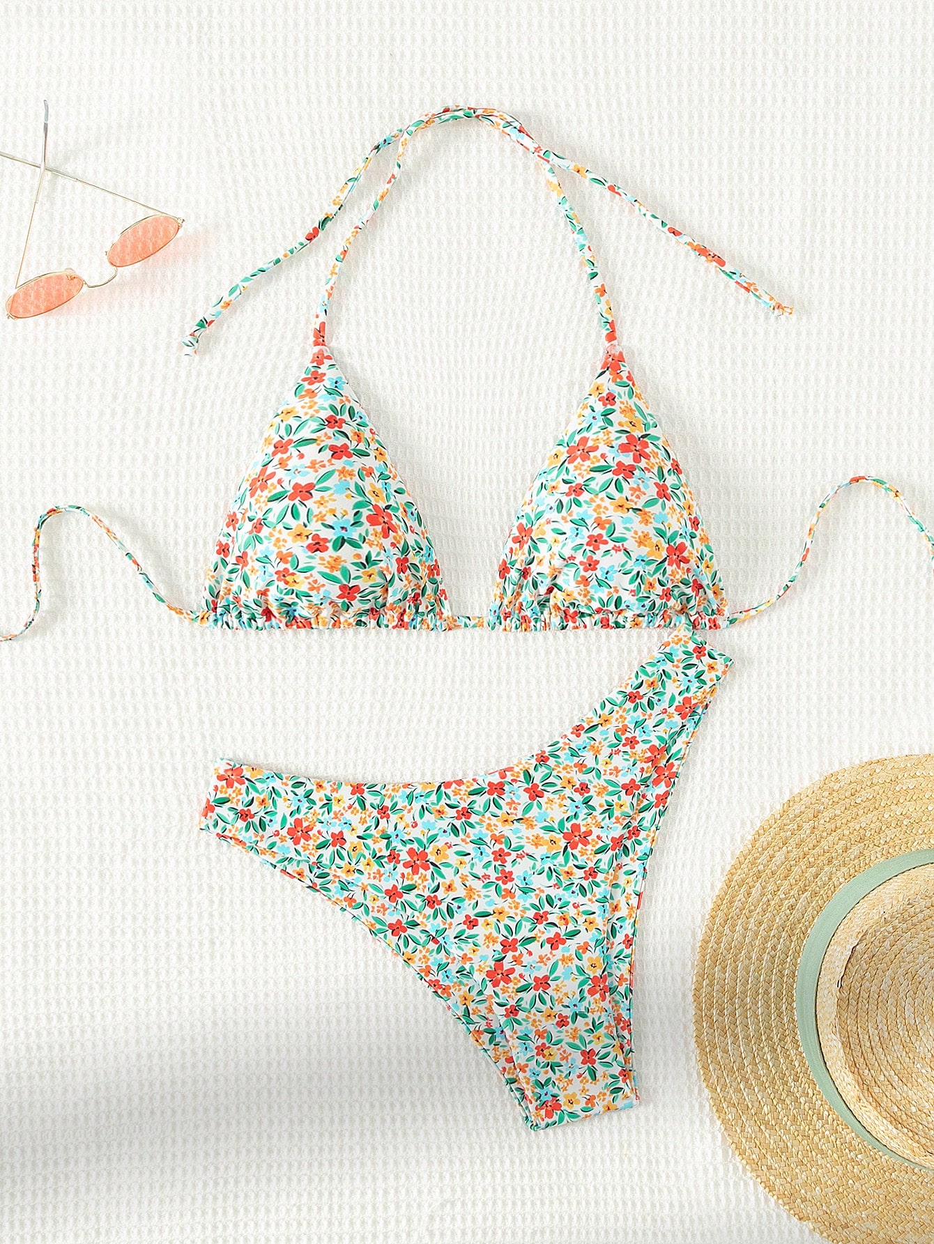 SHEIN Swim Mod Women's Floral Print Halter Neck Strap Swimsuit Set
