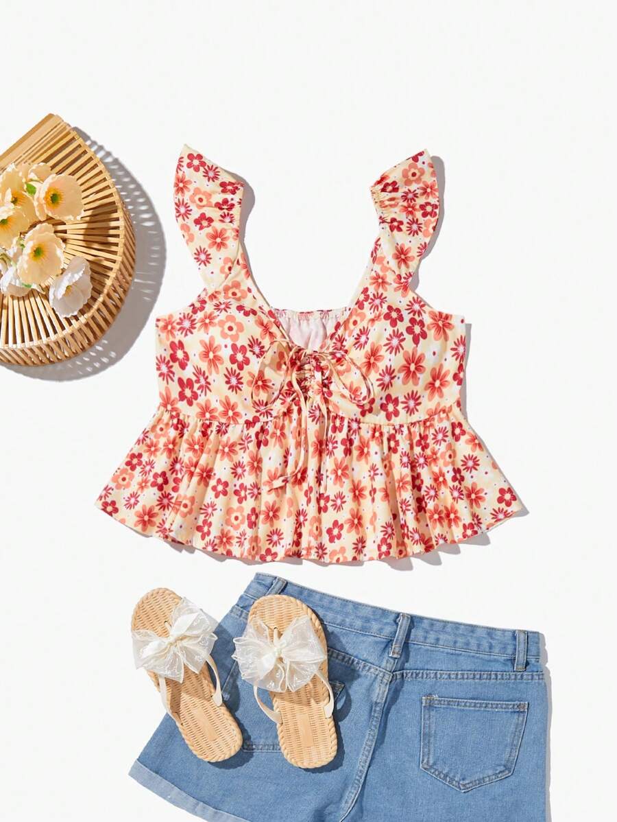 SHEIN WYWH Women's Floral Print Tie Waist Ruffle Hem Decorated Blouse