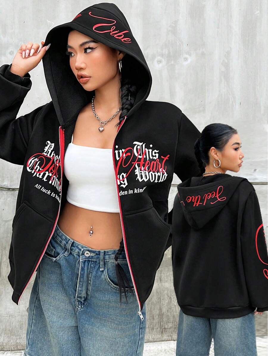 SHEIN Coolane Women's Front Zipper Lettered Hooded Sweatshirt