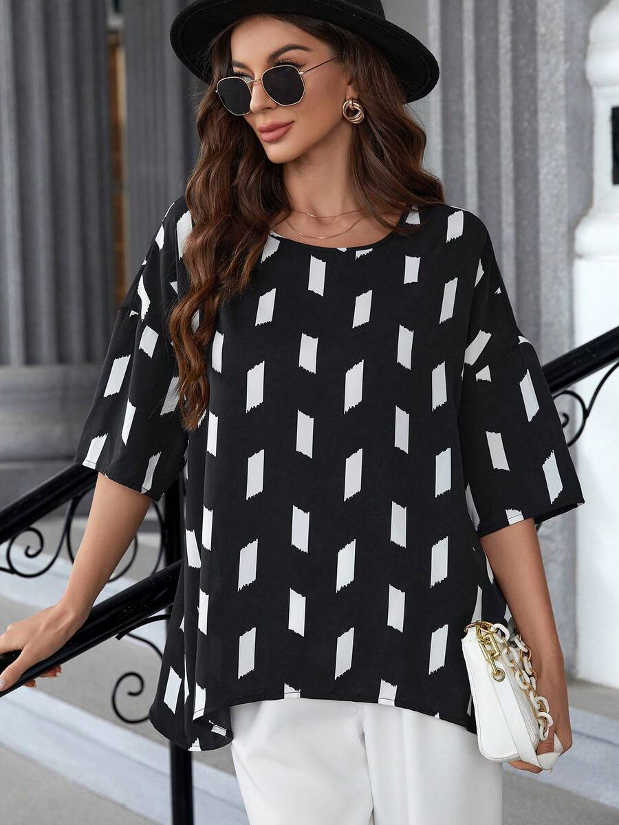 EMERY ROSE Women's Geometric Print Crew Neck Shirt