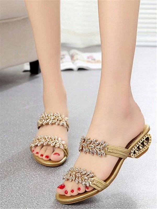 Women's High Heeled Sandals,Lady's Gold Flower Rhinestone Decorated Double-Strapped Face with Open Toes Party Mule Metal Chunky High and Low Heel Sandals