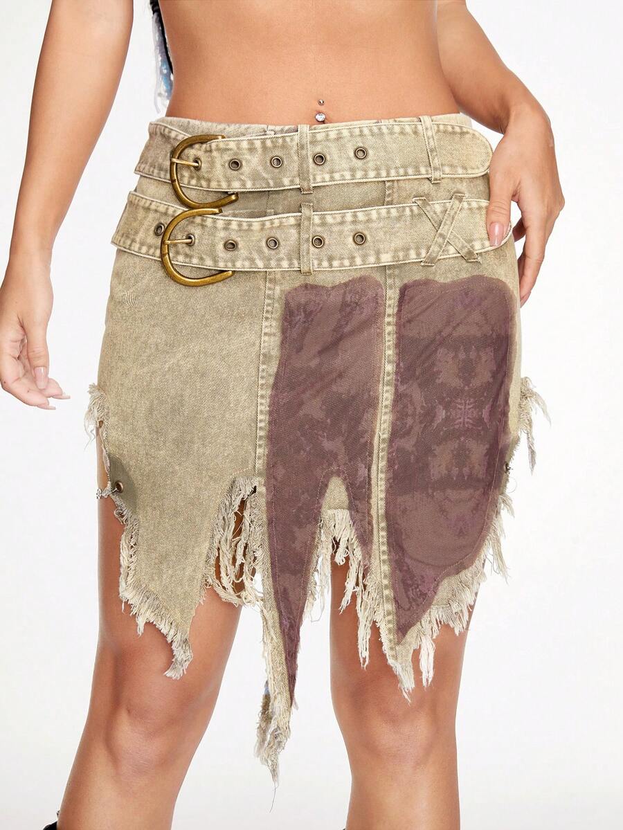 SHEINNeu Women's Irregular Hemline Color-block Skirt With Frayed Edge