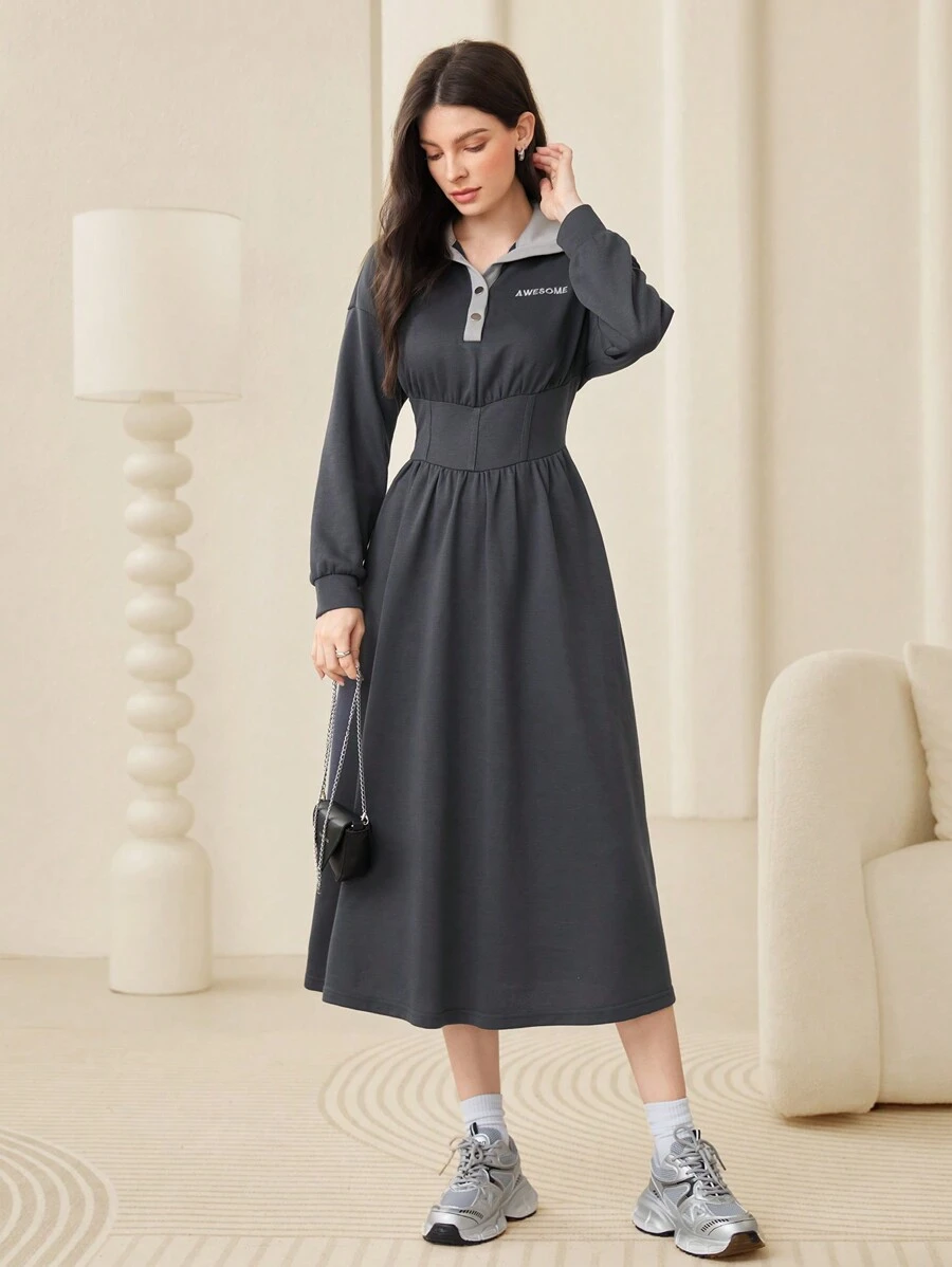 SHEIN Mulvari Women's Letter Embroidery Patchwork Collared High Waist Dress