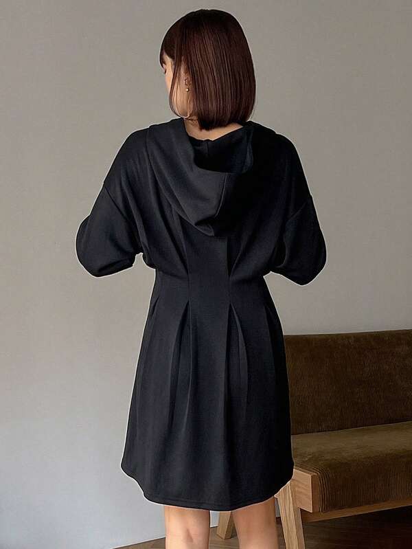 FRIFUL Women's Monochrome Drawstring Hooded Pleated Dress