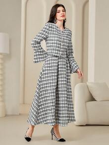 SHEIN Modely Women's Plaid Print Buttoned Shirt With Flare Sleeves And Half-skirt Two-piece Set