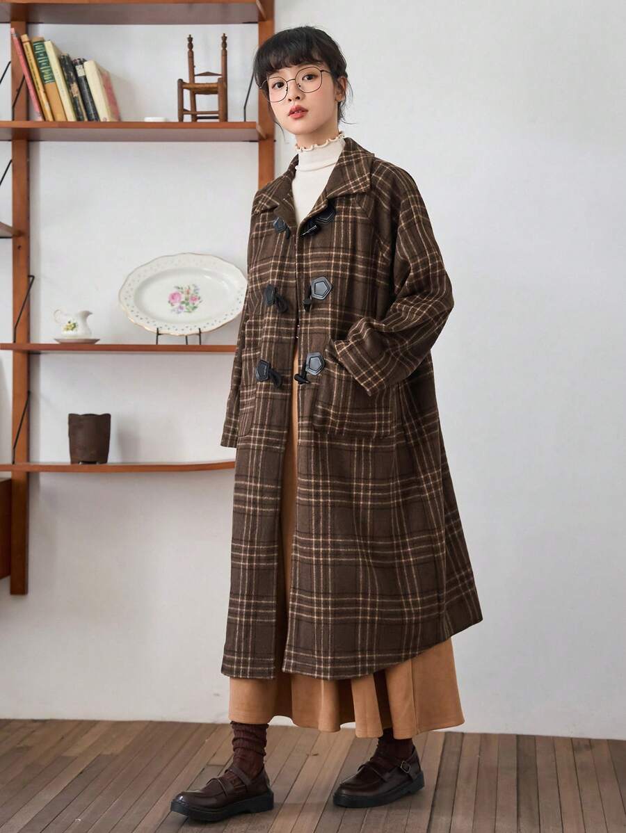 FRIFUL Women's Plaid Woolen Coat With Horn Button