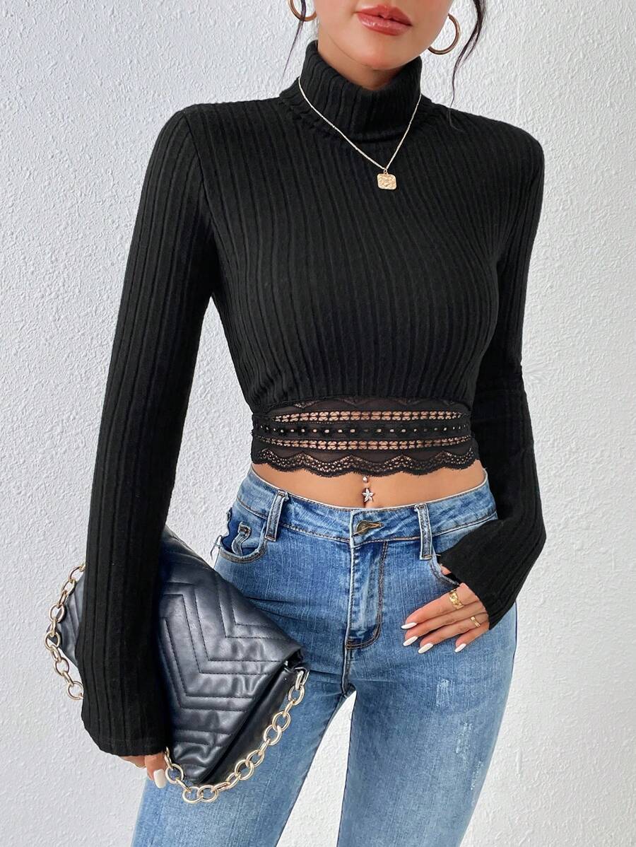SHEIN Frenchy Women's Plain High Neck Lace Hem T-shirt