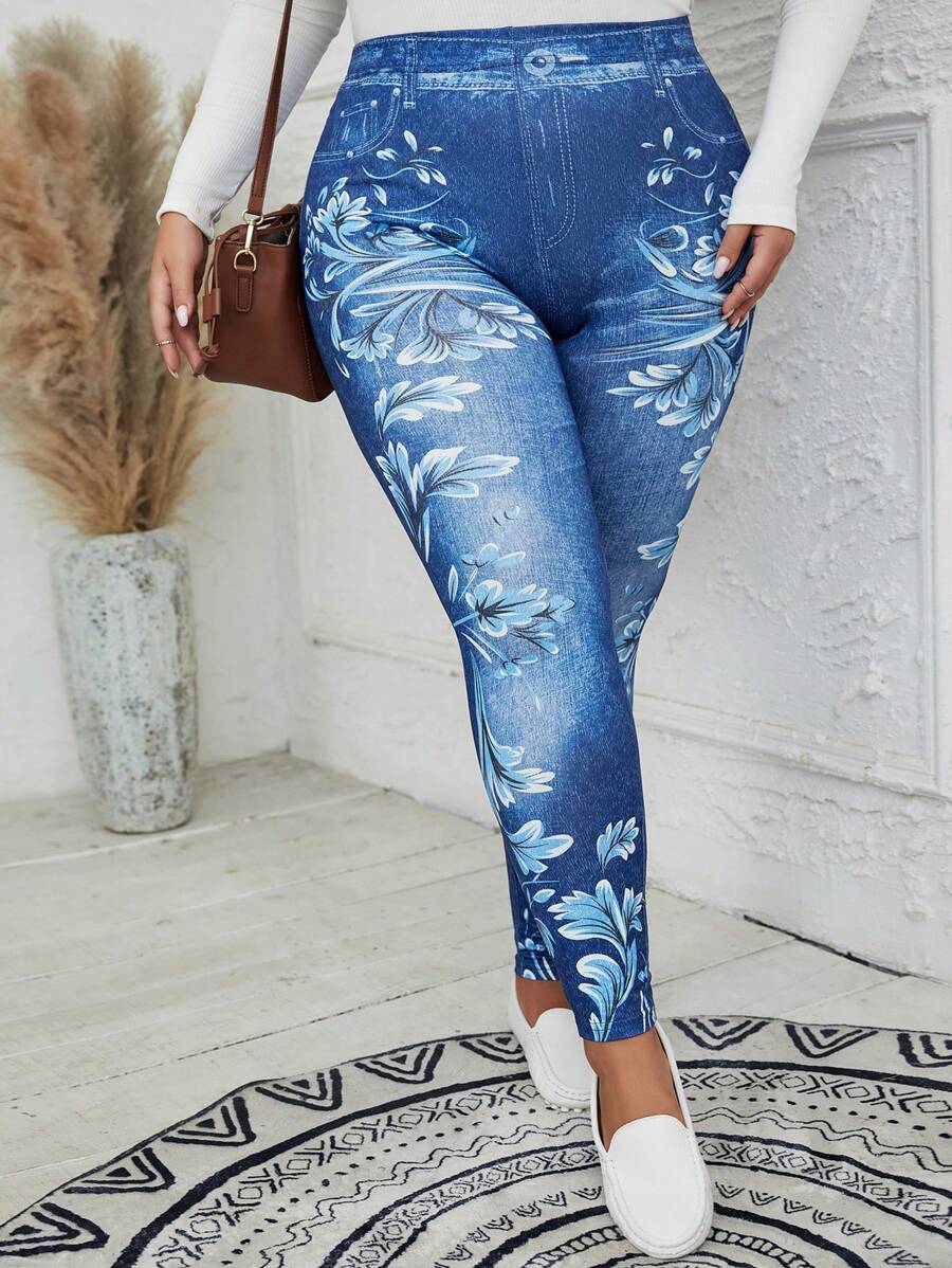 EMERY ROSE Women's Plus Size Flower And Denim Printed Leggings