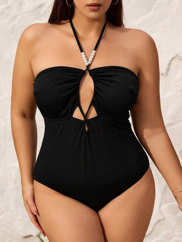 SHEIN Swim Basics Women's Plus Size Pearl & Hollow Out & Ruffle Detail One-piece Swimsuit