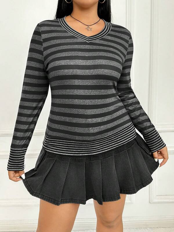 SHEIN EZwear Women's Plus Size Striped V-neck T-shirt