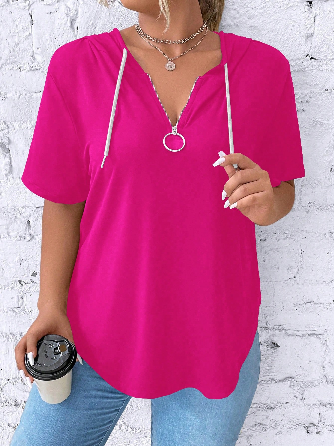 SHEIN LUNE Women's Plus Size Zipper V-neck Short Sleeve T-shirt With Drawstring Hood