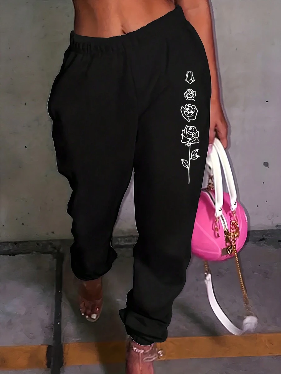 SHEIN LUNE Women's Rose Print Drawstring Cuff Joggers