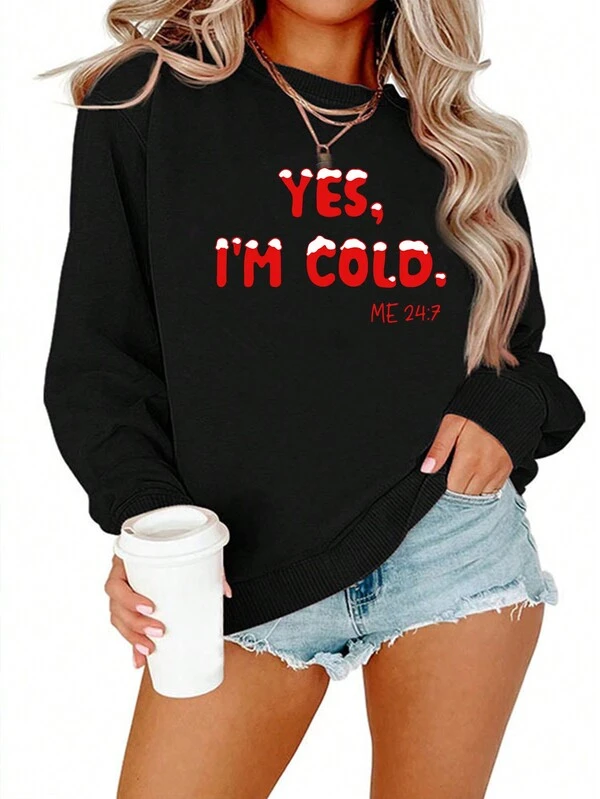 SHEIN LUNE Women's Round Neck Letter Printed Black Long Sleeve Sweatshirt