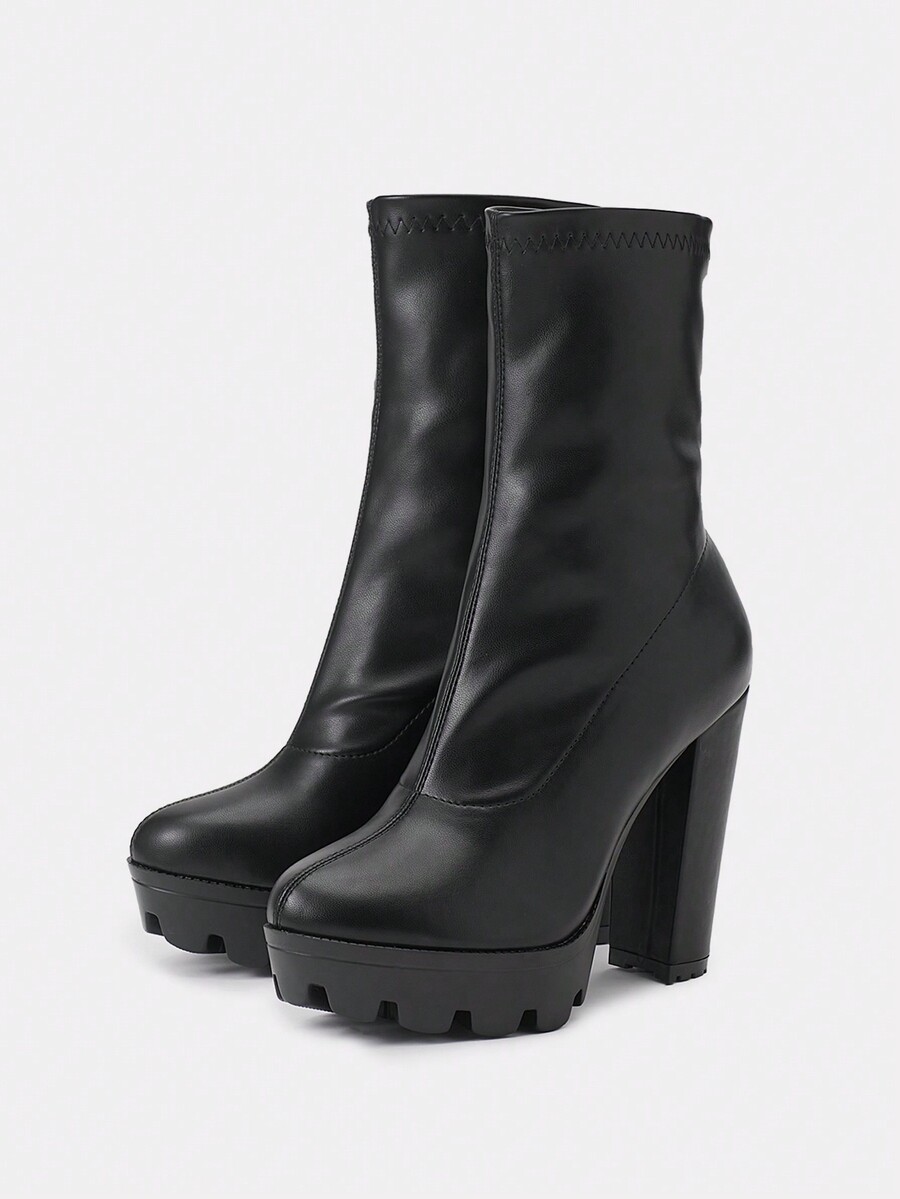 Women's Round Toe Chunky High Heel Waterproof Platform Stretchy Boots
