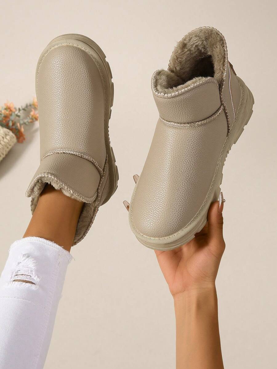Women's Short Snow Boots, Pu Leather Surface, Waterproof, Non-slip, Plush Lined, Warm Flat Ankle Shoes