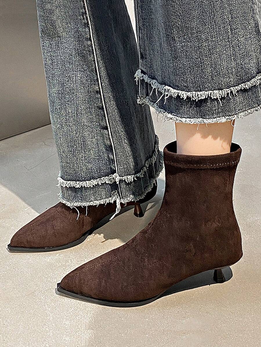 Women's Small High Heel Short Boots Suede Fashion Ankle Boots Elastic Slip-on Women's Boots Brown Winter Women's Shoes