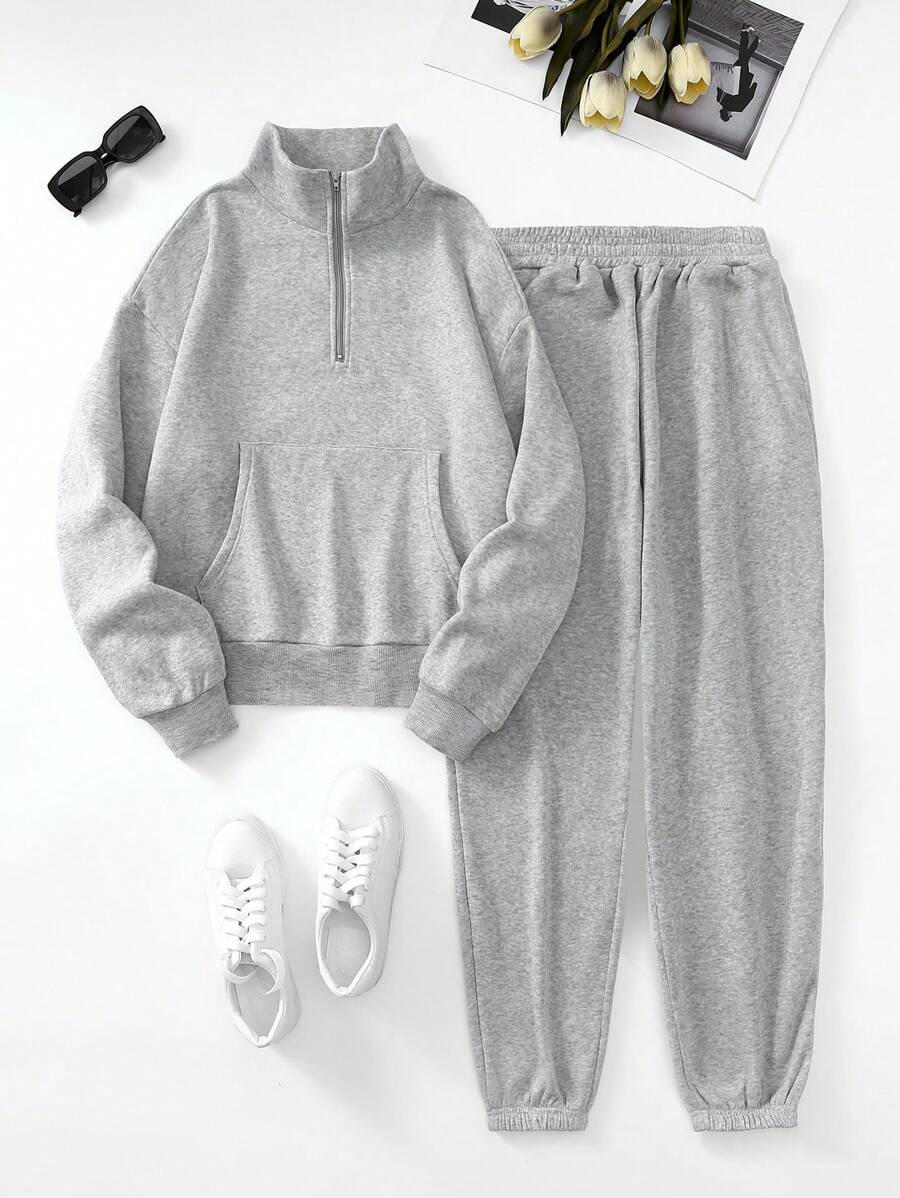 Women's Solid Color Half Zip Sweatshirt And Pants Set