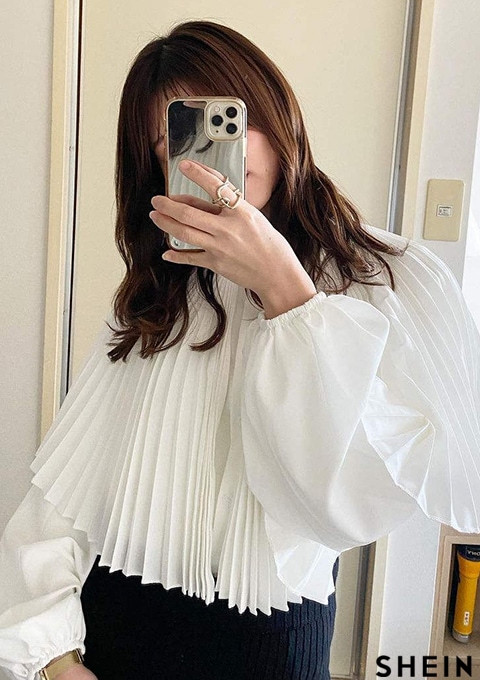 SHEIN Modely Women's Solid Color Ruffle Shawl Lantern Sleeve Shirt