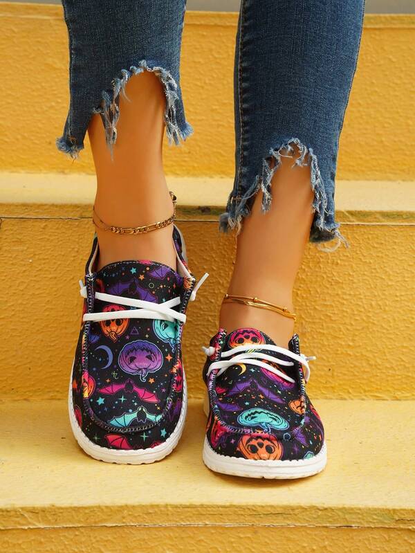Women's Stylish Halloween Colorful Pumpkin Bat Moon Pattern Lace-up Casual Sports Shoes