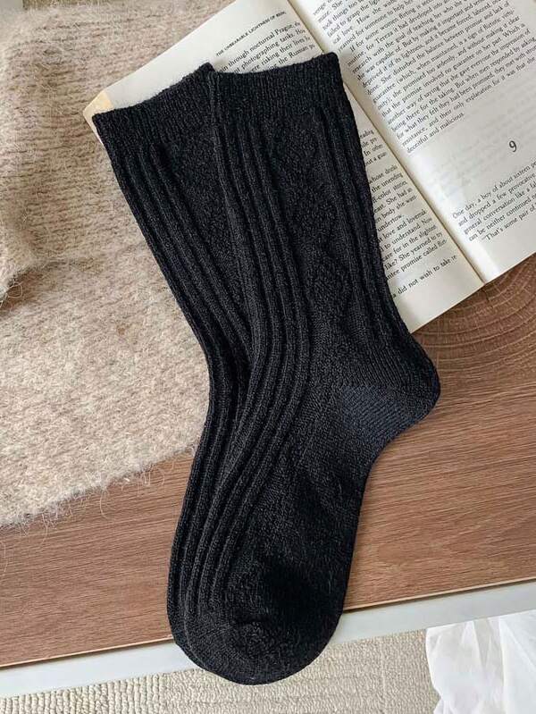 Women's Thickened Warm Woolen Wavy Grid Patterned Mid-calf Socks With Twisted Knit Design For Daily Wear