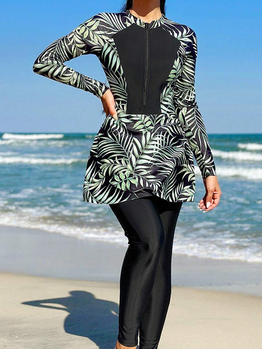 SHEIN Swim Mulvari Women's Tropical Plant Printed Long Sleeve One Piece Swimsuit With Half Zipper And Matching Cover-up Skirt