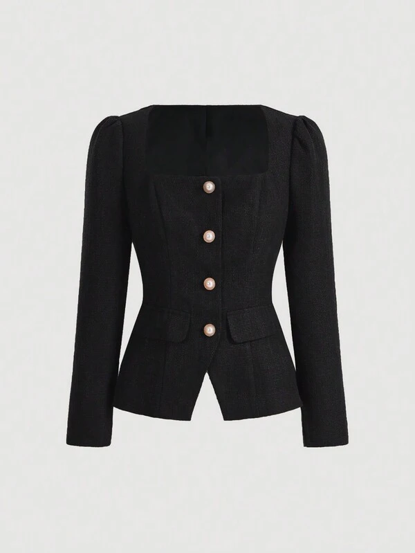 SHEIN MOD Women's Woolen Coat With Square Collar And Single-breasted Button Closure
