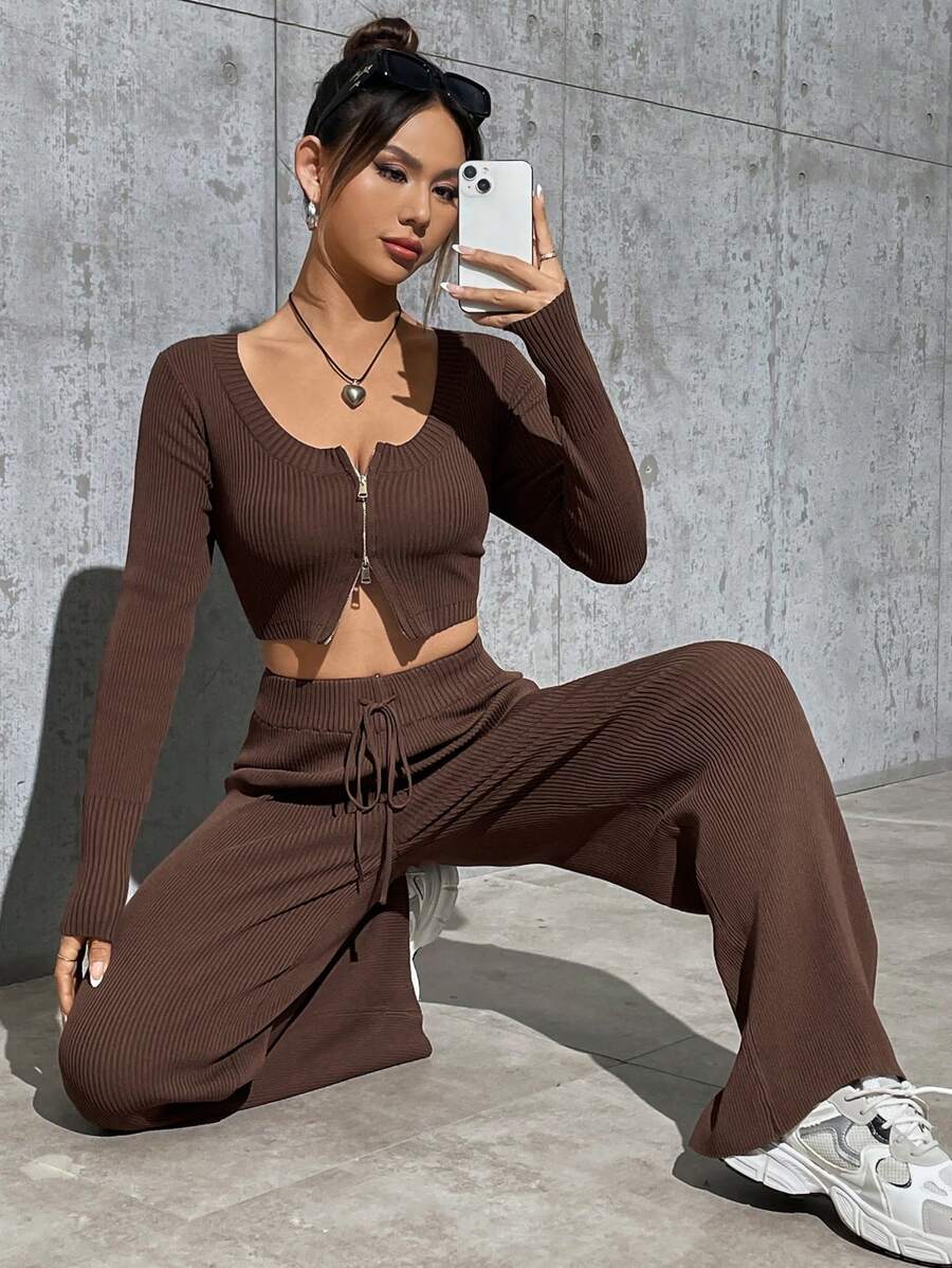 Women's Zipper Front Cardigan And Drawstring Waist Flare Leg Knit Pants 2 Piece Set