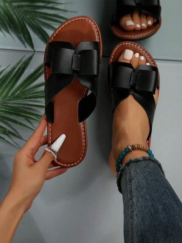 Women Bow Decor Flat Sandals, Elegant Summer Slide Sandals