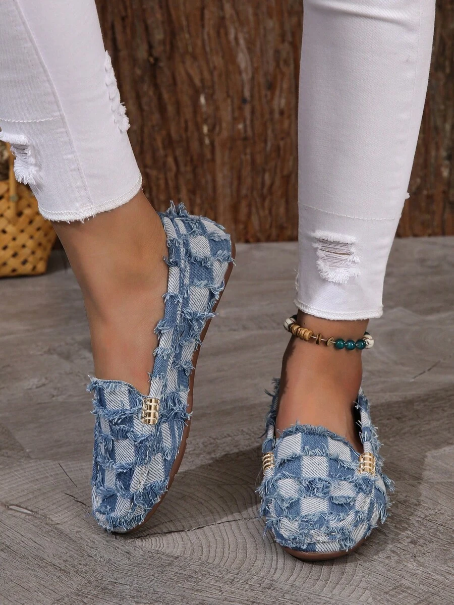 Women Checkered Pattern Raw Trim Design Flats, Fashion Fabric Loafers For Outdoor
