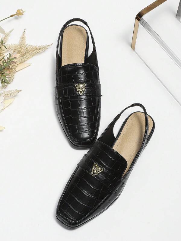 Women Crocodile Embossed Leopard Head Decor Square Toe Slingback Flats, Elegant Black Ankle Strap Sandals