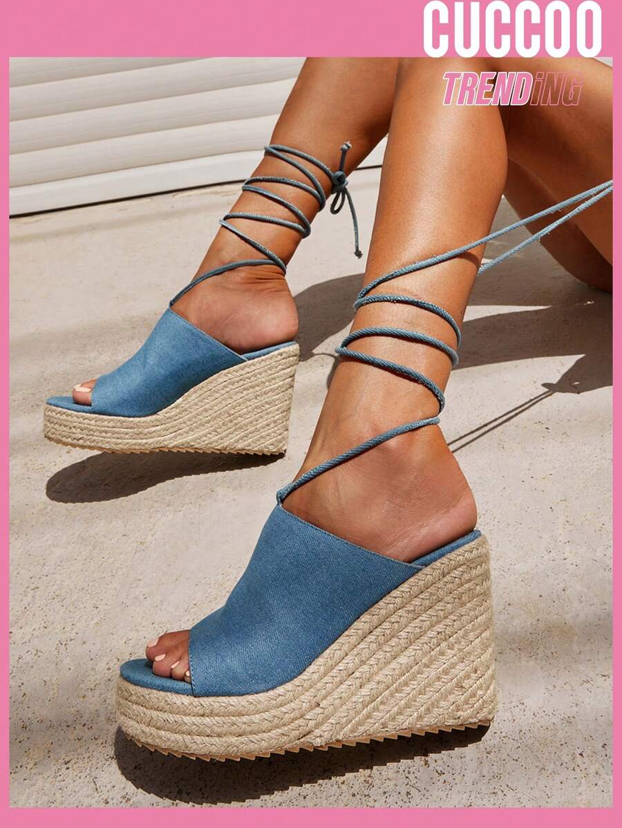 Cuccoo Destination Collection Women Minimalist Sandals, Vacation Denim Blue Strappy Wedge Sandals
