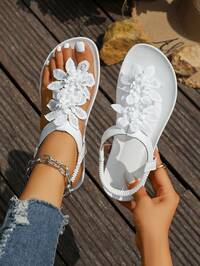 White Floral Slip-On Sandals, Elastic Design, Flat Comfortable, Outdoor Casual, Sports Beach, Scarf Print Beach, PU Leather Flower, Suitable For Home, Outdoor, Gym, Office, Party, College, Wedding, Holiday, Summer #6 Bestseller