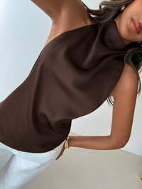 Siren Gaze Women's Asymmetric Neck Draped Ruched Waist Blouse, Sexy Elegant Office Lady Top, Featuring Metal Button Decor On Shoulder, Fashionable, Commute, Elegant, Sexy, Holiday, Beach, Hawaii, Draped Neck, Outerwear Brown Summer Casual #1 Bestseller