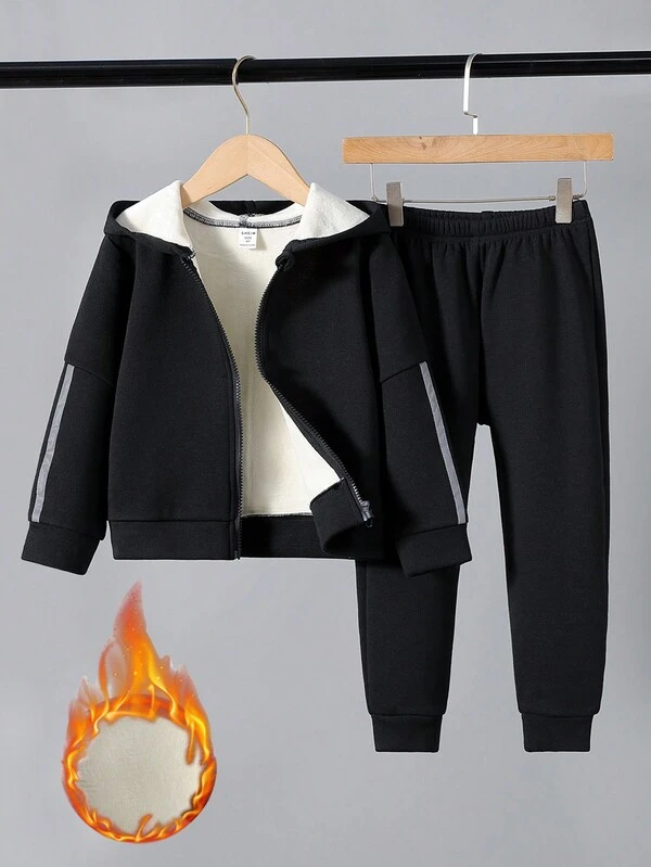 Young Boy 1pc Contrast Tape Thermal Lined Zip Up Hooded Jacket & 1pc Sweatpants