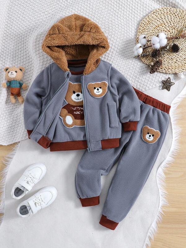 Young Boy Bear Patched Zip Up 3D Ears Hooded Vest Jacket & Sweatpants & Sweatshirt