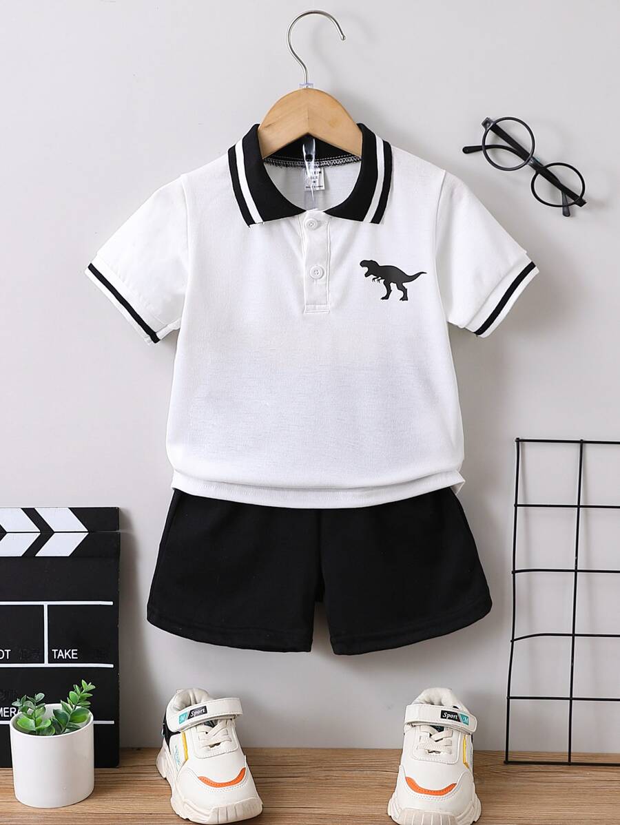 SHEIN Young Boy Black And White Dinosaur Print Polo Shirt And Shorts Set, Summer