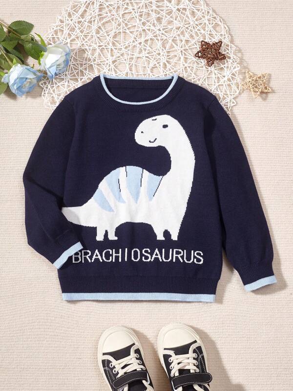Young Boy Dinosaur & Letter Pattern Striped Trim Sweater