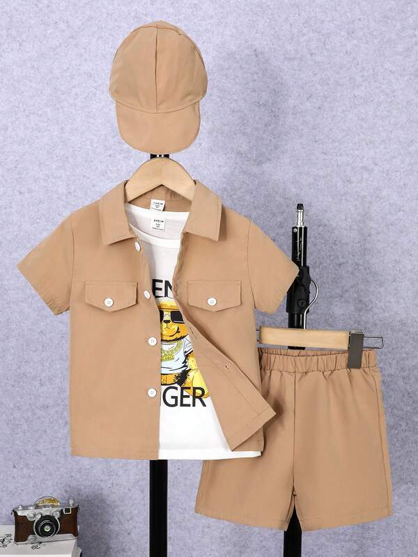 SHEIN Kids EVRYDAY Young Boy Flap Detail Shirt & Bear Print Tee & Shorts & Cap