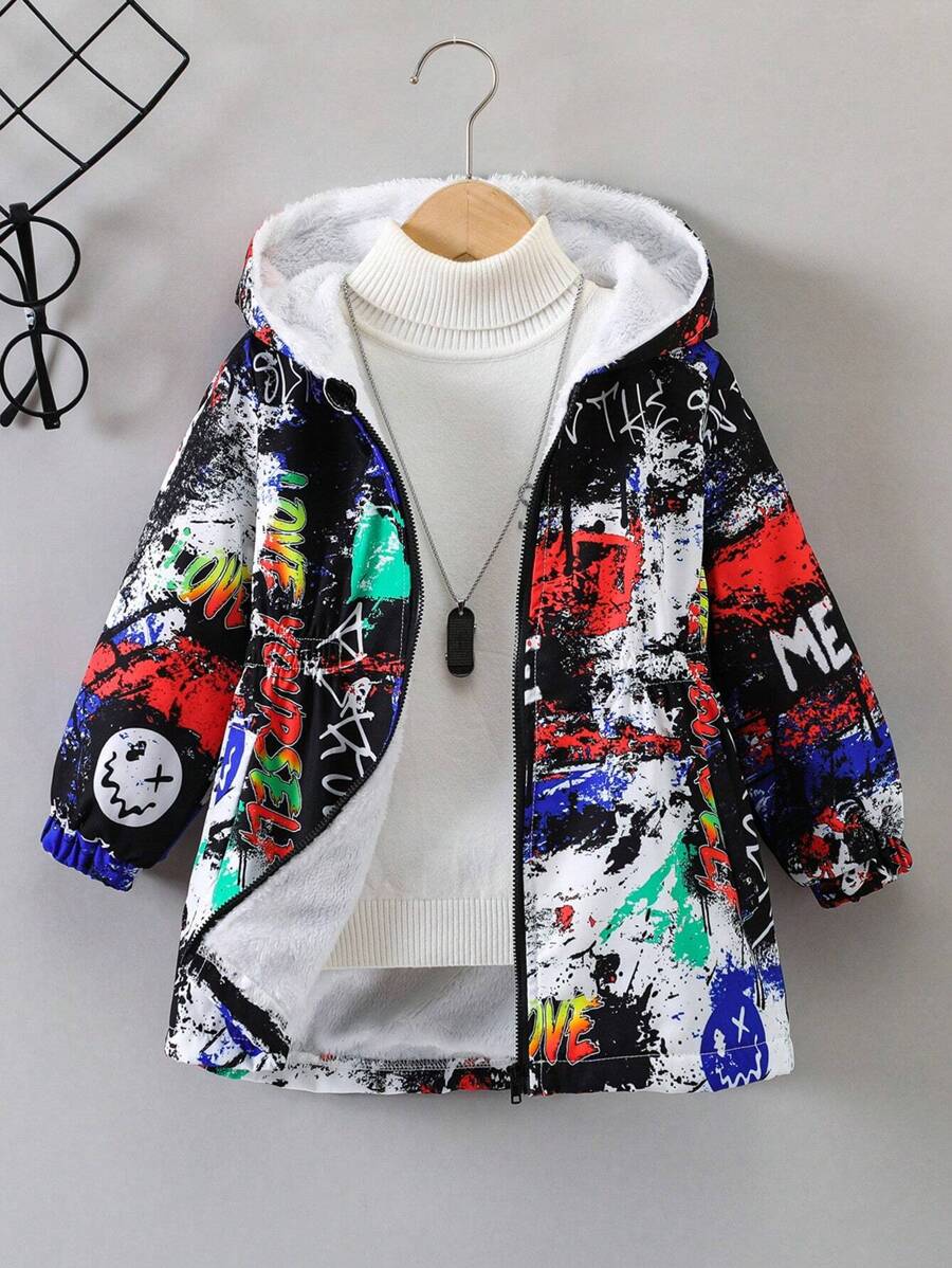 SHEIN Young Boy Graffiti Print Plush Lined Hooded Winter Coat Without Sweater