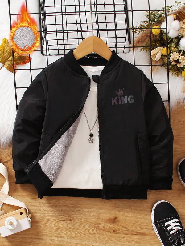 Young Boy Letter & Crown Print Zip Up Thermal Lined Bomber Jacket