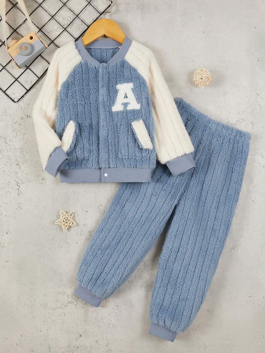 SHEIN Young Boy Letter Embroidery Raglan Sleeve Flannel Jacket & Pants
