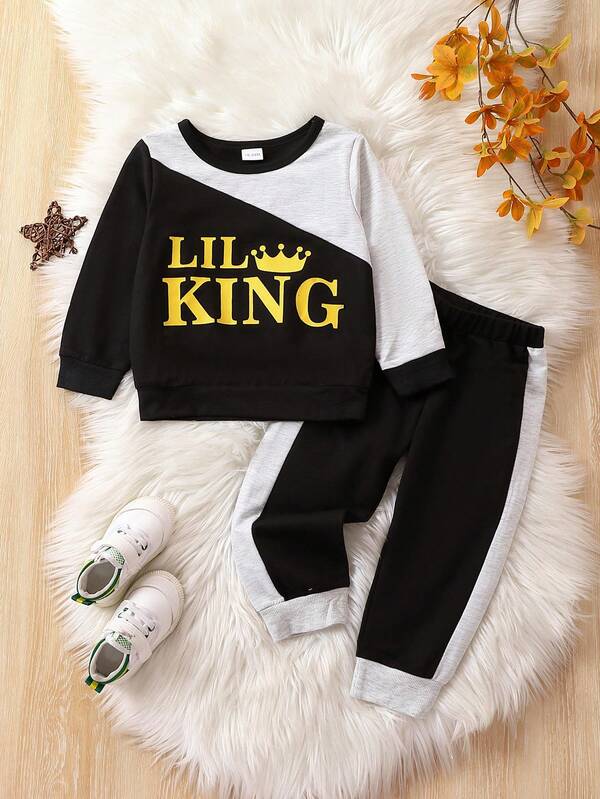 Young Boy Letter Graphic Colorblock Sweatshirt & Contrast Side Seam Sweatpants