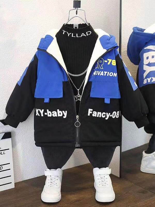 Young Boy Letter Graphic Colorblock Thermal Lined Hooded Coat Without Tee