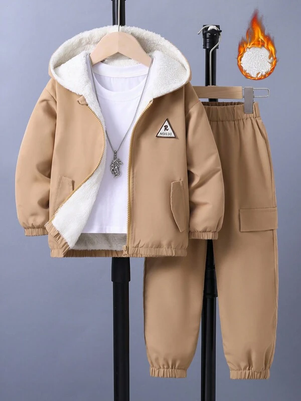 Young Boy Letter Patched Detail Thermal Lined Hooded Jacket & Pants Without Tee