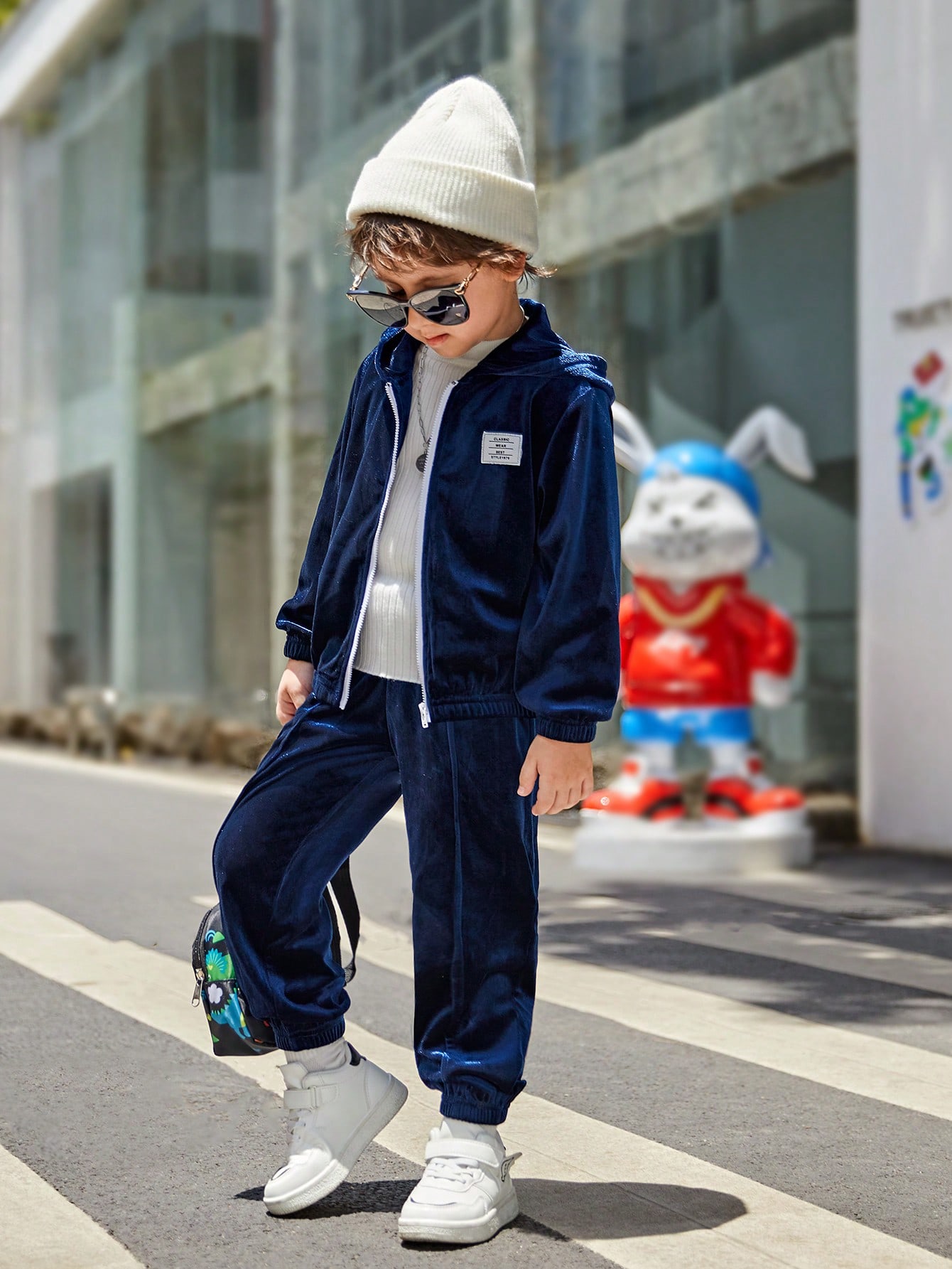 SHEIN Kids EVRYDAY Young Boy Letter Patched Detail Velvet Zipper Sweatshirt & Sweatpants