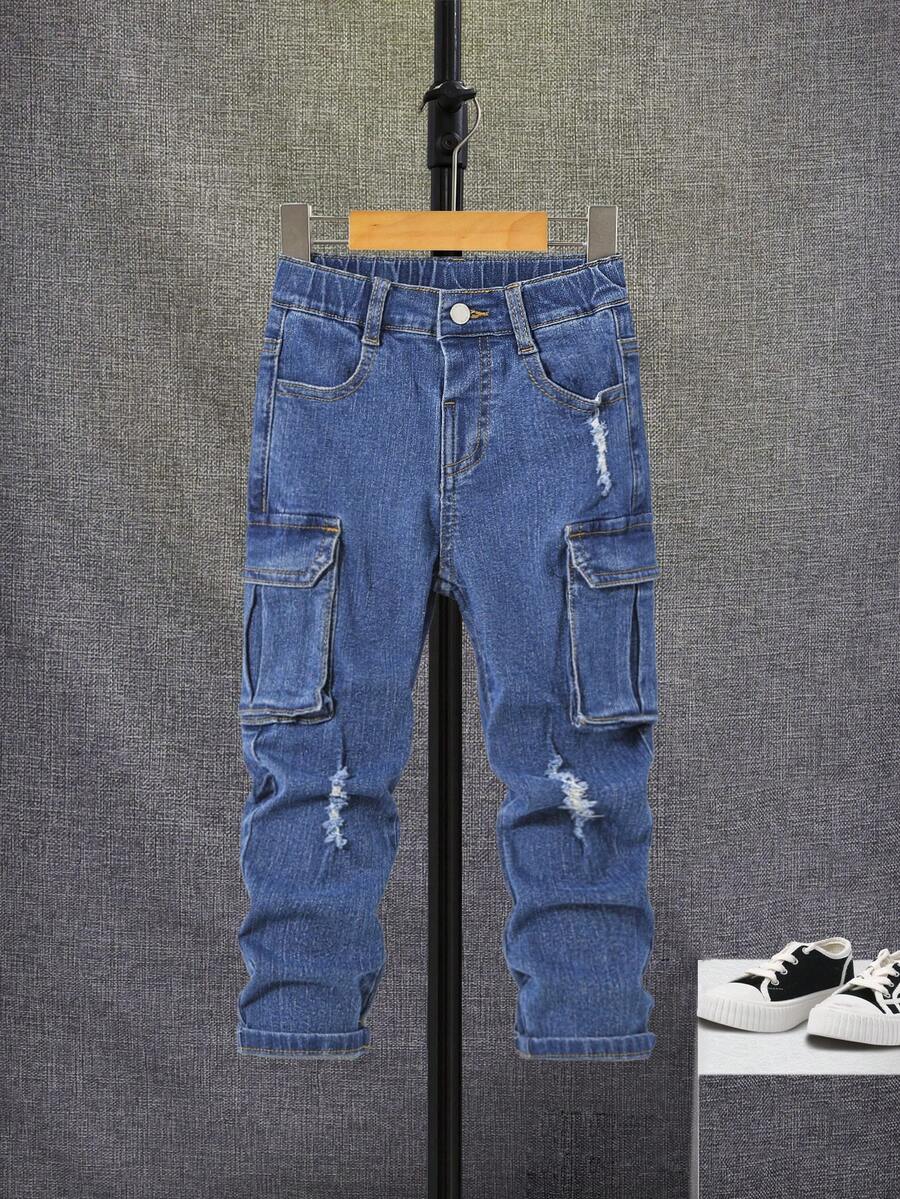 SHEIN Young Boy Ripped Frayed Flap Pocket Side Cargo Jeans