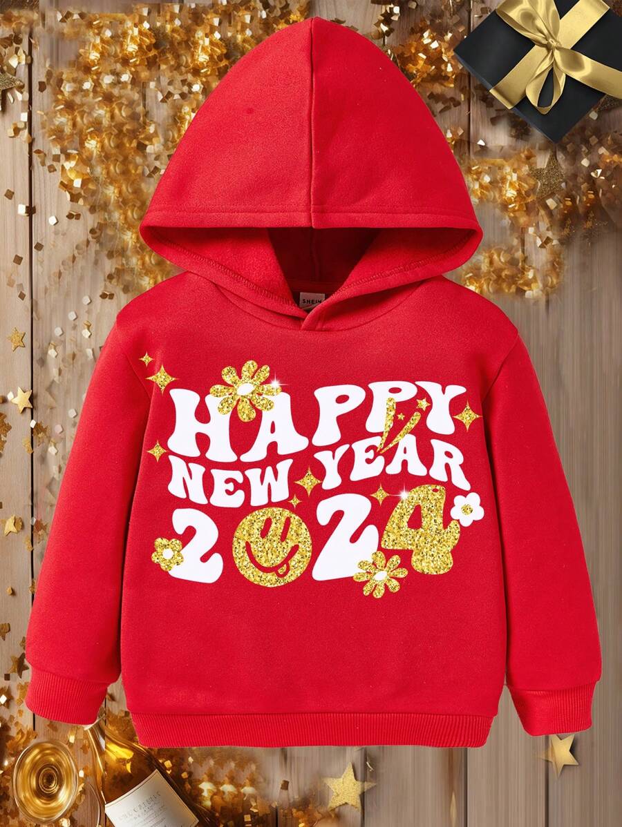 SHEIN Young Boys' Casual Happy New Year Letter Printed Hoodie, Suitable For Autumn And Winter