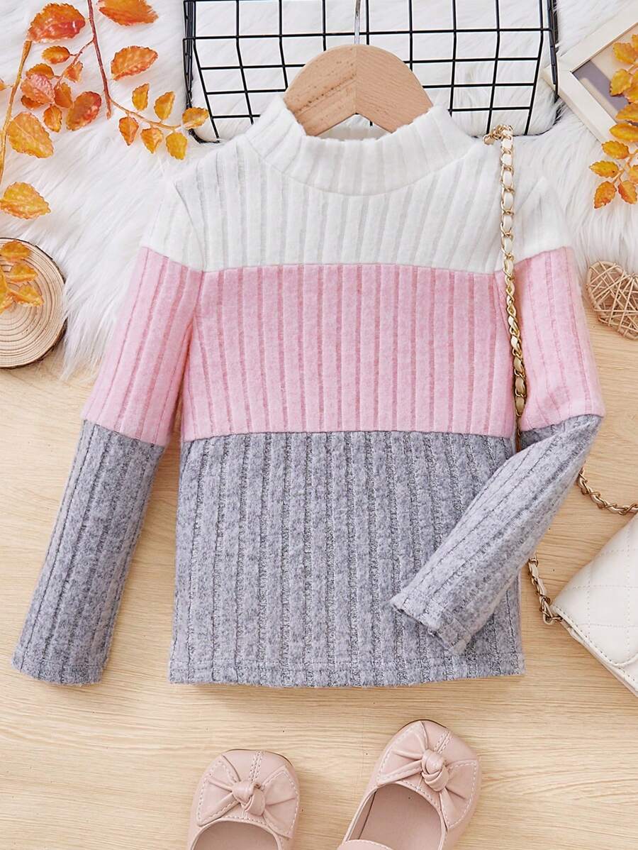 SHEIN Kids Cooltwn Young Girl's Fashionable Street-Style Knit Fuzzy Round Neck Contrast Color Long Sleeve T-Shirt
